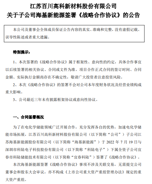 為在電化學儲能領域廣泛開展合作,充分發揮各自的優勢,加速電化學儲能市場拓展, 7月19日,深圳市科陸電子科技股份有限公司下屬全資子公司宜春市科陸儲能技術有限公司與江蘇海基新能源股份有限公司達成合作共識并簽署了戰略合作協議。